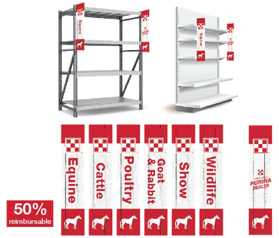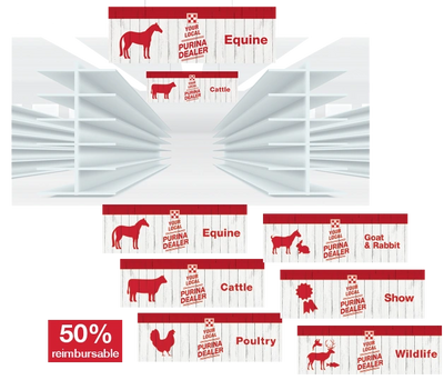 With a printed whitewash wood background and Purina® Animal icons in red, these Aisle Definers will clearly define each section in your feed department aisles.